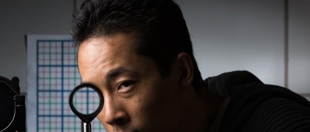 University of Rochester PhD student Joseph Choi demonstrates his `cloaking' device using just four lenses. Credit: Adam Fenster / University of Rochester
