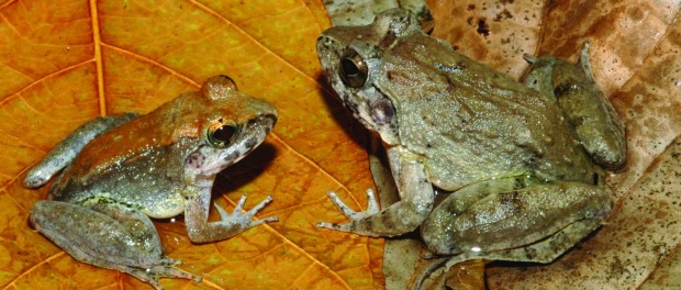 The L. larvaepartus frog (male, left, and female) from the island of Sulawesi in Indonesia. It is the only frog known that gives birth to tadpoles rather than laying spawn. Credit: Jim McGuire photos.