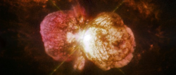 Eta Carinae's great eruption in the 1840s created the billowing Homunculus Nebula, imaged here by Hubble. Now about a light-year long, the expanding cloud contains enough material to make at least 10 copies of our sun. Astronomers cannot yet explain what caused this eruption. Image Credit: NASA, ESA, and the Hubble SM4 ERO Team