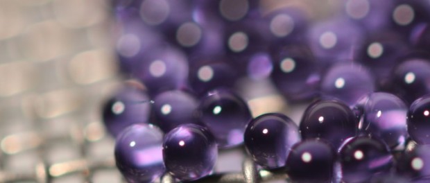 Microcapsules containing sodium carbonate solution are suspended on a mesh during carbon dioxide absorption testing. The mesh allows many capsules to be tested at one time while keeping them separated, exposing more of their surface area. Credit: John Vericella, Lawrence Livermore National Laboratory.