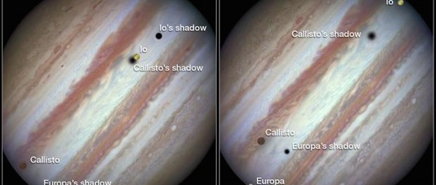 The image on the left shows the Hubble observation at the beginning of the event. On the left is the moon Callisto and on the right, Io. The shadows from Europa, which cannot be seen in the image, Callisto, and Io are strung out from left to right.